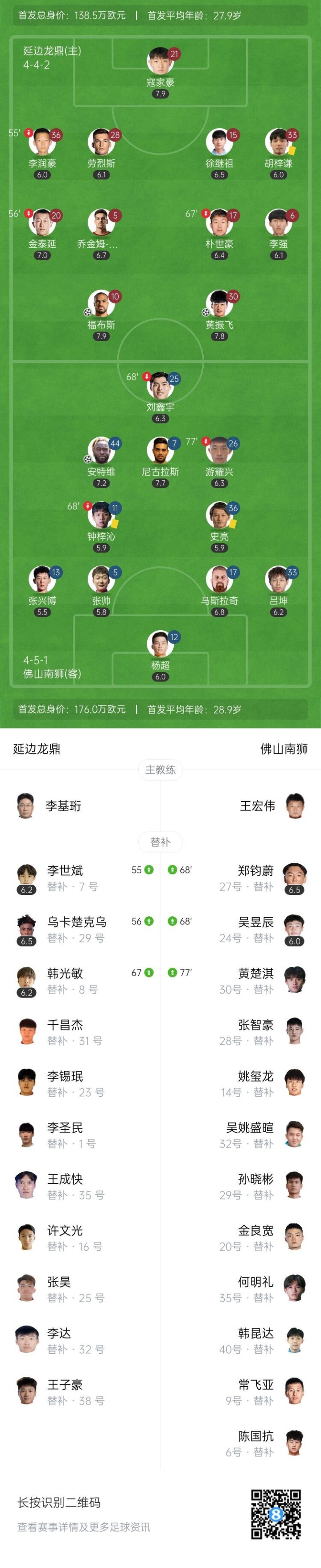 伤停补时5分钟。全场结束,延边龙鼎4-1佛山南狮。