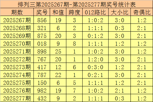 开奖回顾:排列三第2025288期奖号开出:504,组选类型:组六,大小比为1:2,奇偶比为1:2,和值为9,跨度为5。