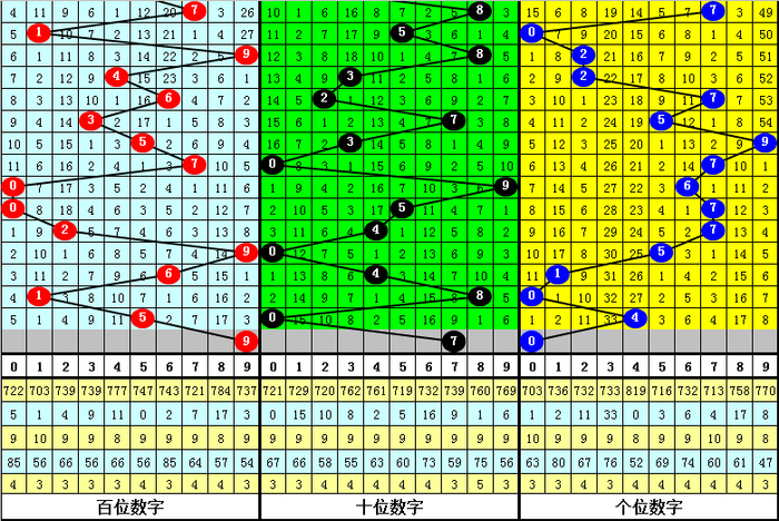 一、在以上统计中,表现最热的四个奖号为:7、0、5、8,一般来说这四码中包含当期开奖号码,本期看好号码0出现;走势最冷的三个奖号为:3、2、6,在实际开奖中当期奖号不会全部出现在这三码中。