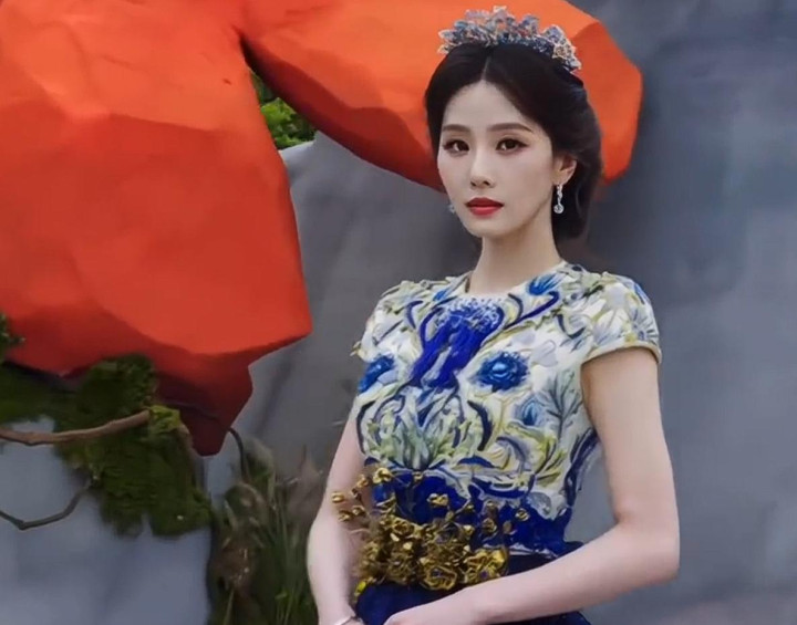 就像今年3月底的四川峨眉山红毯,别的女星都在拼露肤、拼设计,她一身蓝色重工礼服全裹出镜,头顶皇冠,腰背挺直,天鹅颈线条流畅。