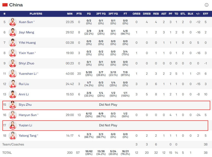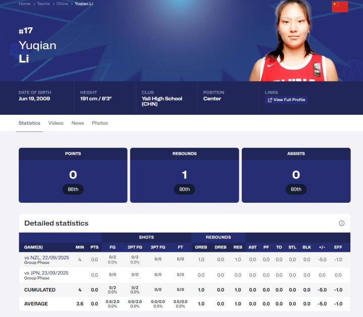 她仅在对阵新西兰的比赛中登场3.6分钟,2中0,拿0分1篮板0助攻0抢断0盖帽,最关键的是这两场比赛李玉乾连一张特写都没有。